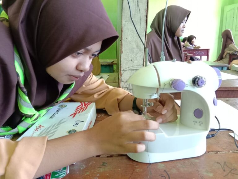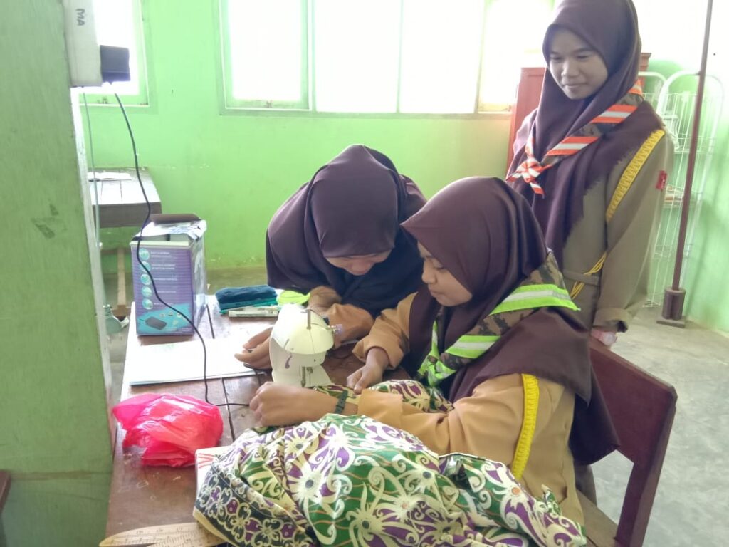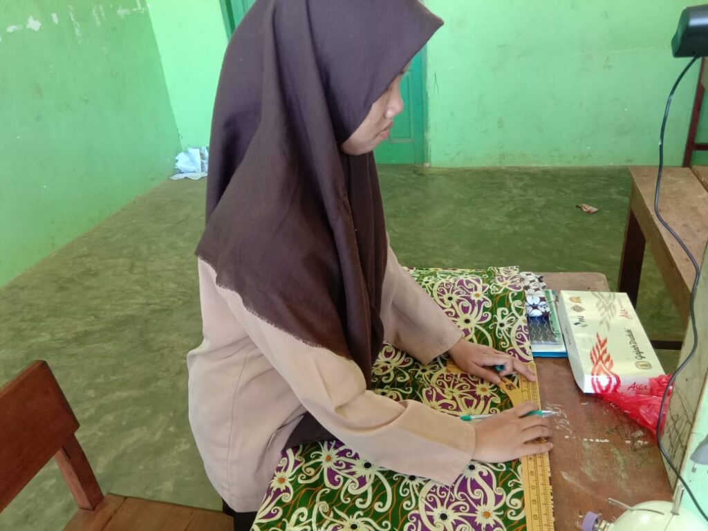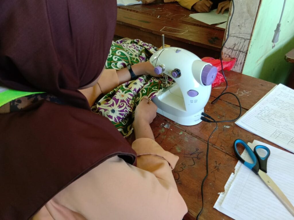 Kegiatan belajar menjahit menggunakan mesin jahit electrik mini.