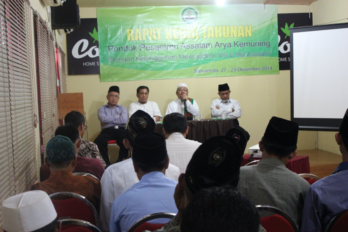 Dengan izin Allah SWT Pondok Pesantren Assalam Arya Kemuning melaksanakan rapat kerja ke 2 (27-29 Desember 2014) di Samarinda. Rapat kerja ini menyusung tema “Dengan Kesungguhan Mewujudkan Visi dan Misi Assalam”.