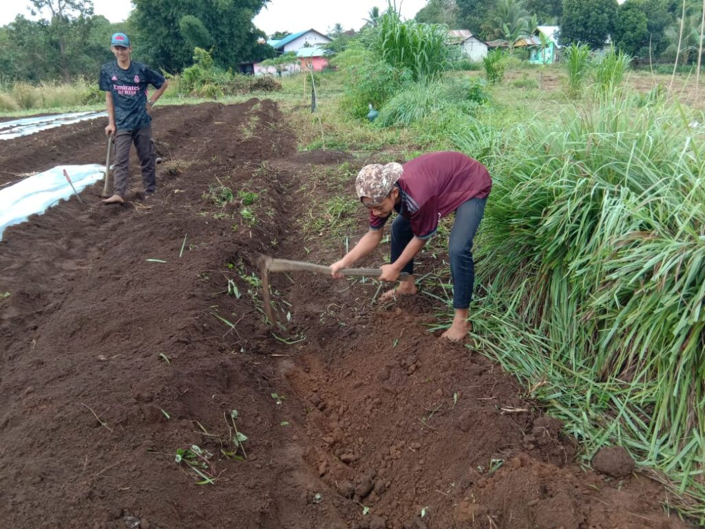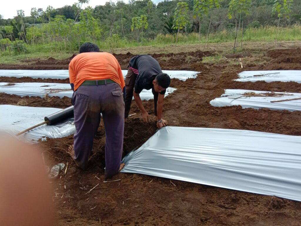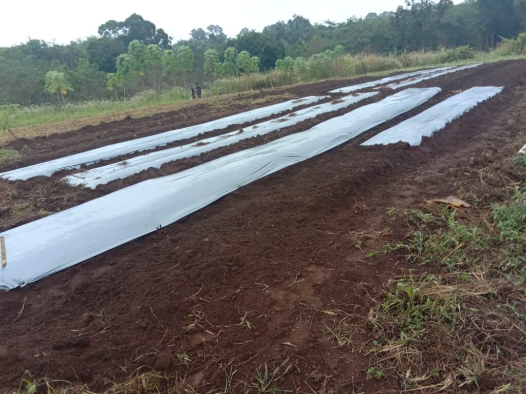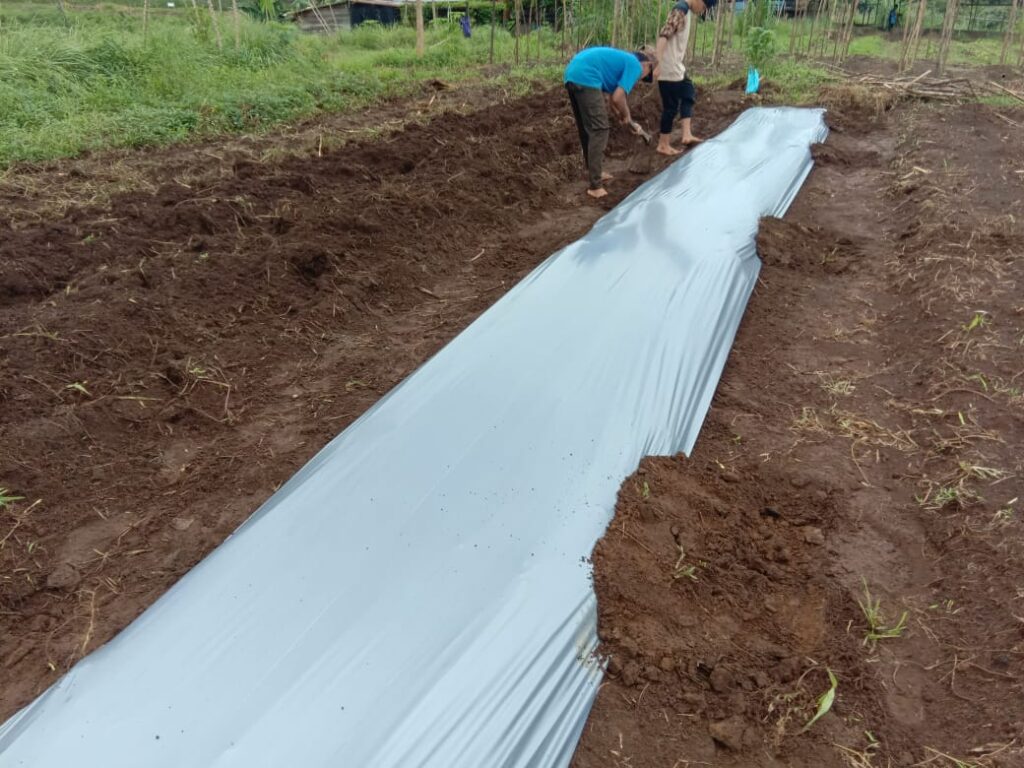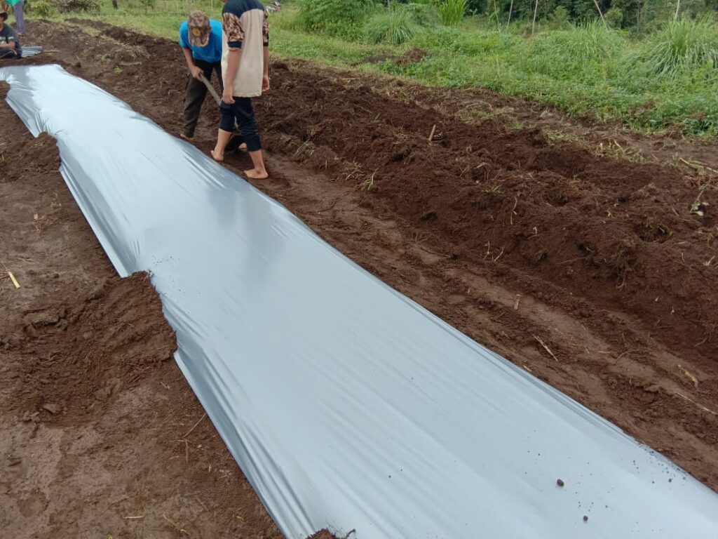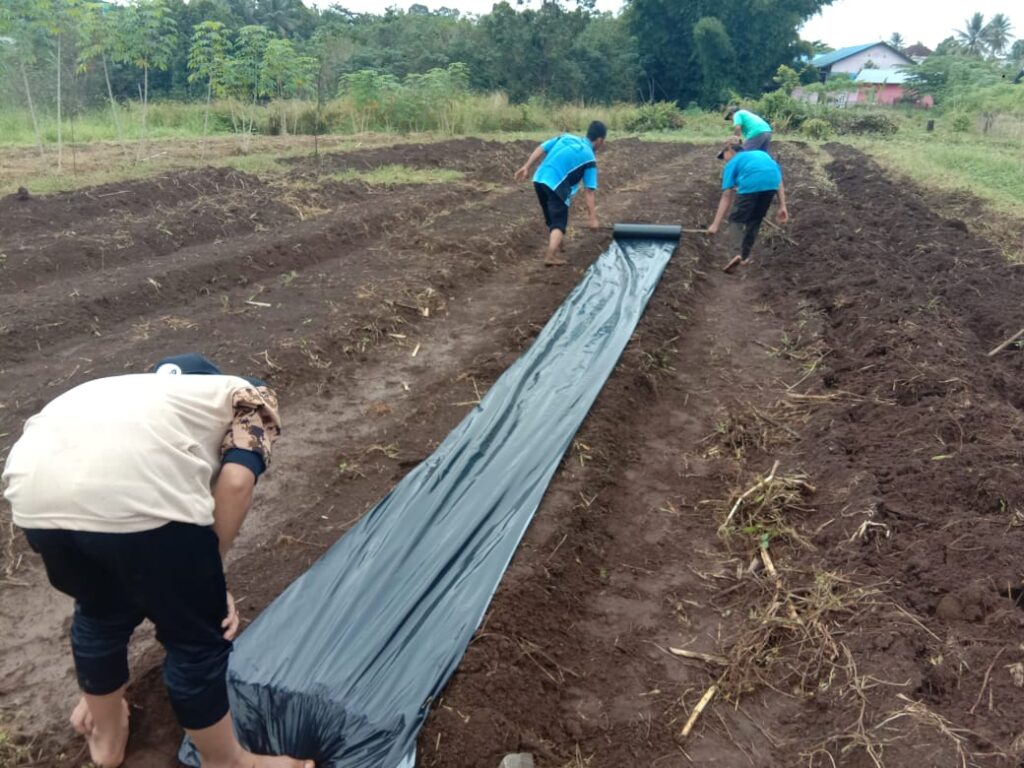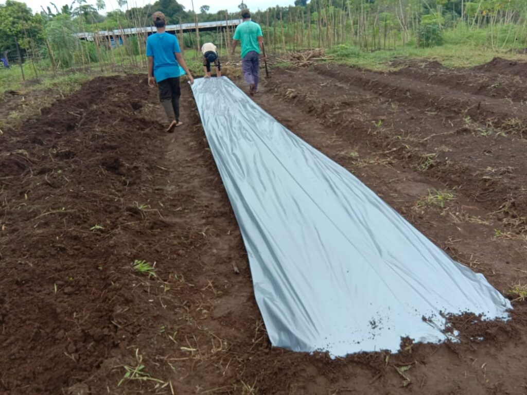 Proses pemasangan mulsa untuk melapukkan tanah dan rumput yang sudah dicampur pupuk organik