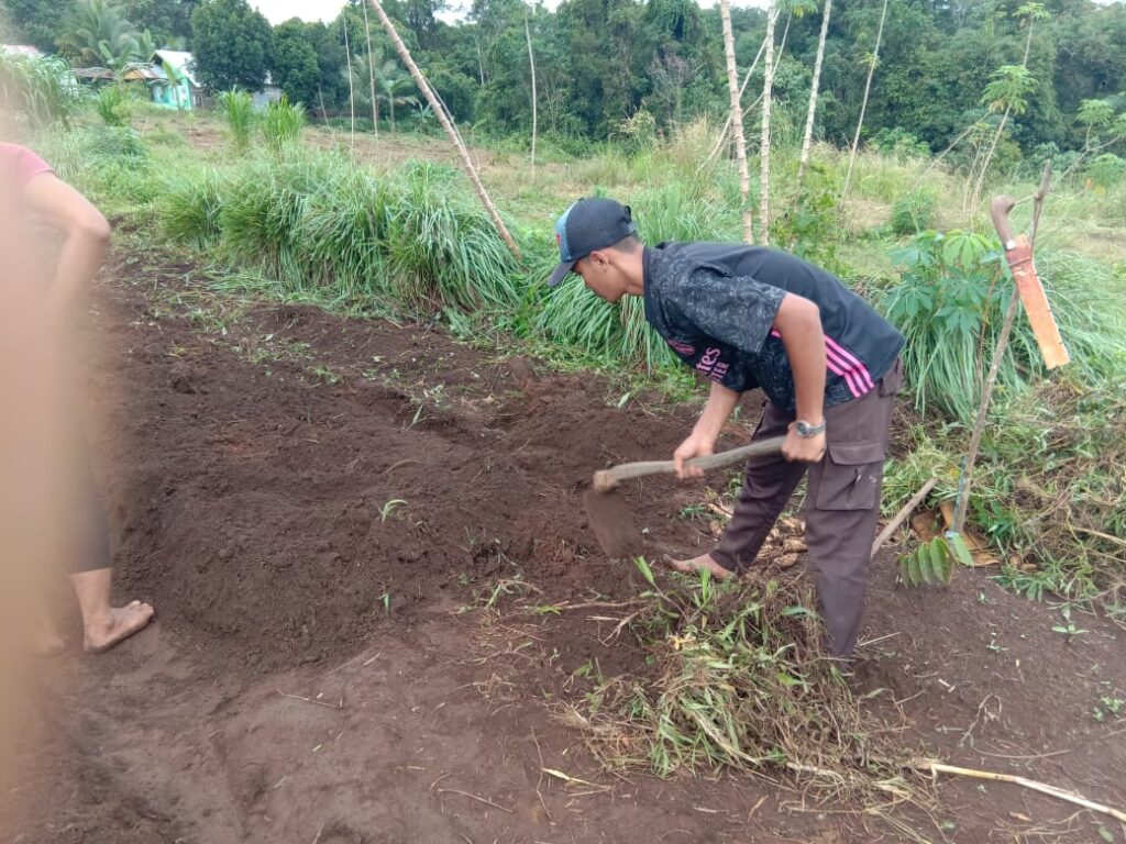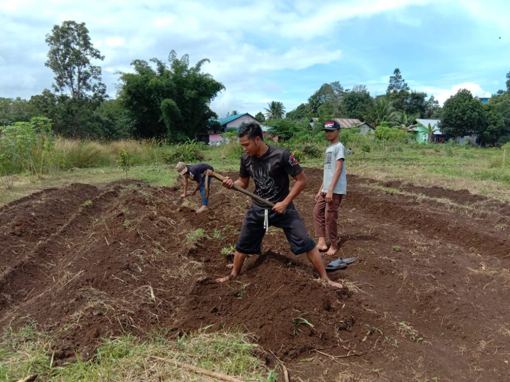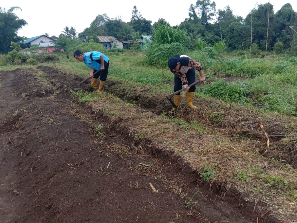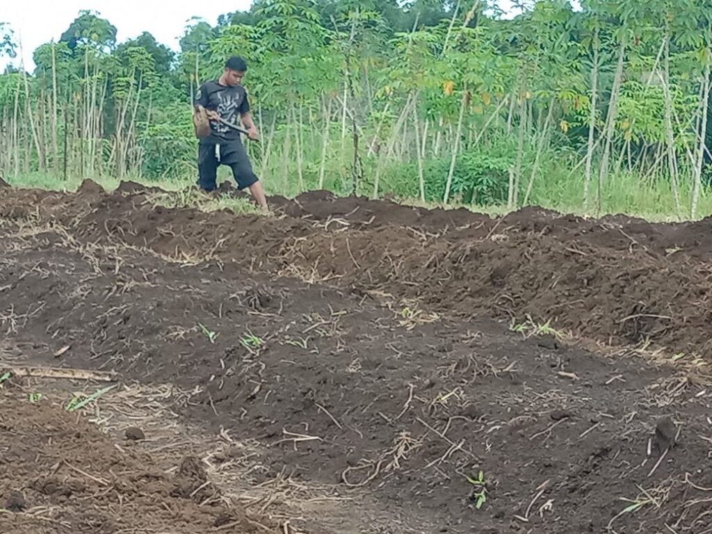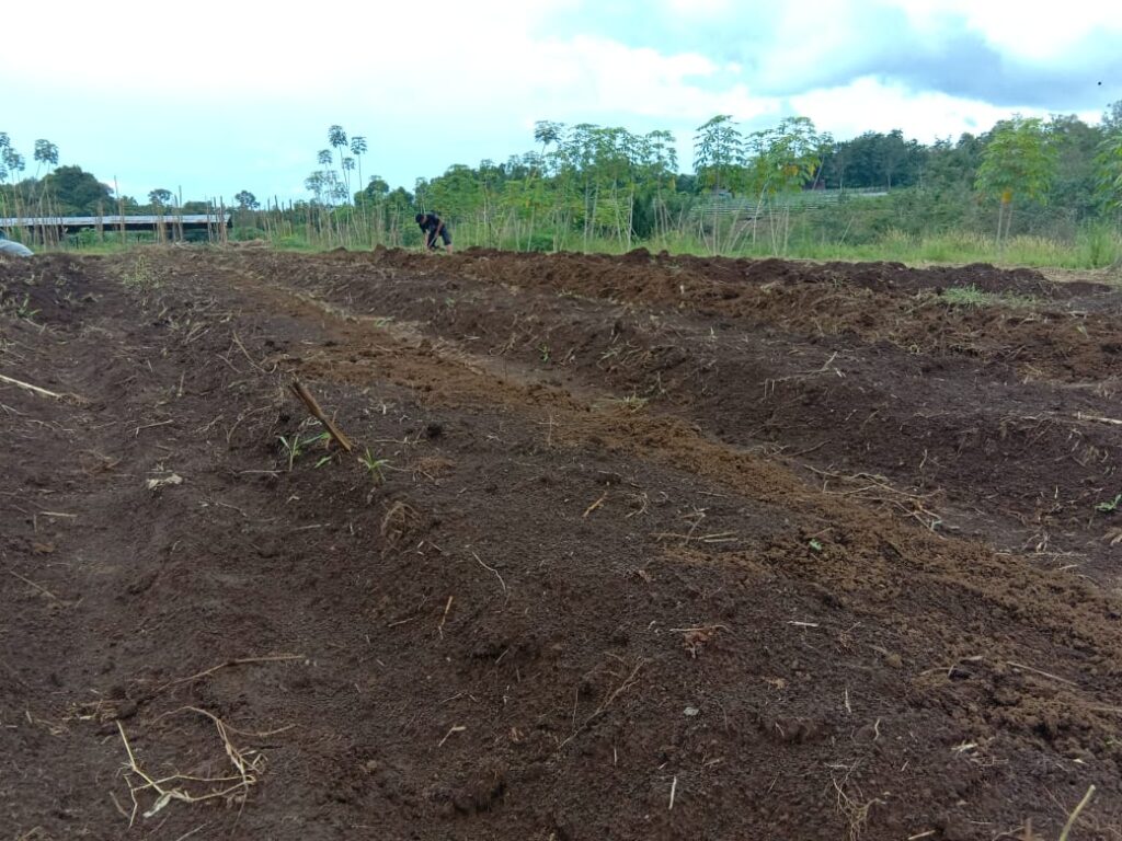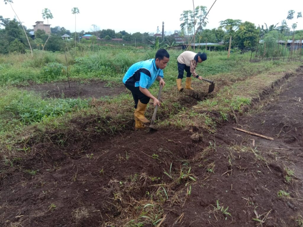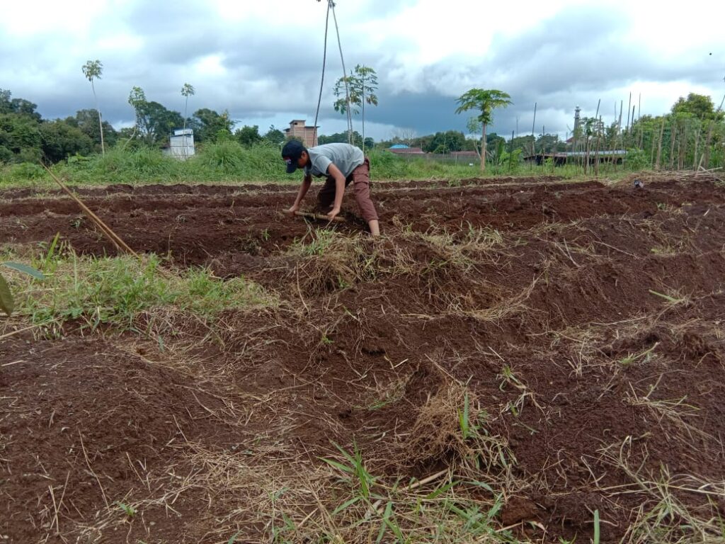 Proses pemasangan mulsa untuk melapukkan tanah dan rumput yang sudah dicampur pupuk organik