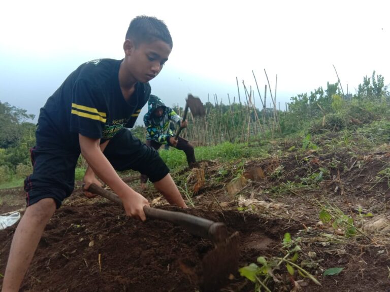 Alhamdulillah etos kerja kemandirian santri bidang perkebunan terus berkarya, setelah panen jagung, kangkung dan kacang panjang, para santri mengolah lahan dan mencangkul untuk dibuat bedengan baru.