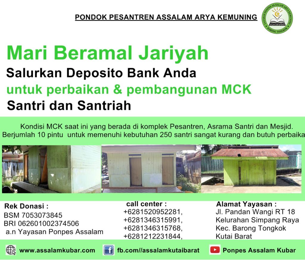 Assalamualaikum wr wb, Jamaah kaum muslimin yang dimulyakan Allah, Para Donatur dan Simpatisan PP Assalam. Melalui silaturrahim ini, Assalam menawarkan kehadapan Bapak/Ibu sekalian program perbaikan dan pembangunan MCK untuk santri dan santriah PP Assalam.