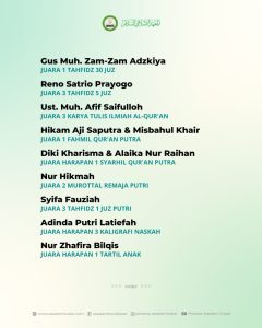 Kepada juara-juaranya, semoga kemenangan ini menjadi motivasi untuk terus menggali potensi dan memperkaya pengetahuan kalian dalam Islam. Tetaplah menjadi teladan bagi teman-teman santri lainnya dan teruslah berkontribusi positif dalam memperkuat keagamaan dan kebaikan di masyarakat. Selamat sekali lagi, semoga Allah selalu memberkahi perjalanan kalian dalam mengejar ilmu dan kebaikan.