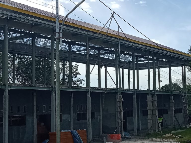 Setelah proses pemasangan rangka atap dan plester dinding kusen jendela pintu lantai 1. Saat ini adalah Melanjutkan pemasangan atap dan plester dinding kusen jendela pintu lantai 1 .
